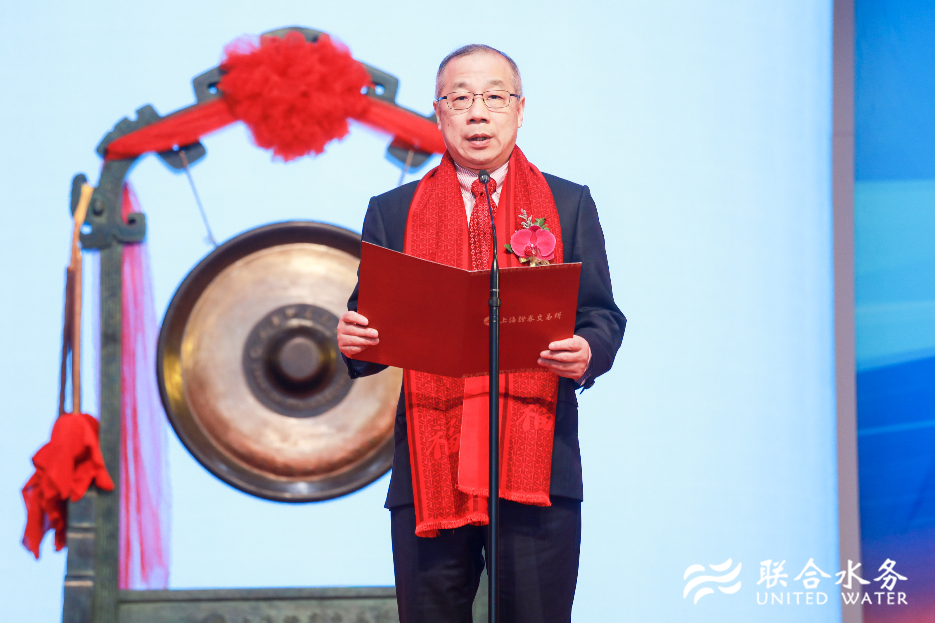 董事長兼總裁俞偉景在儀式上致辭 儀式上,聯合水務董事長兼總裁俞偉景與上海證券交易所黨委委員、副總經理董國群簽訂了《上市協議書》。